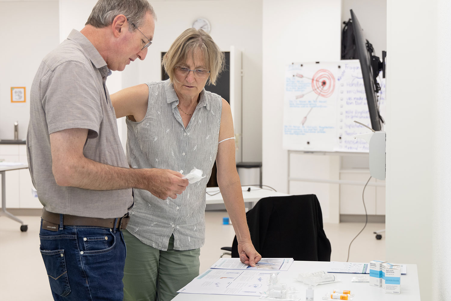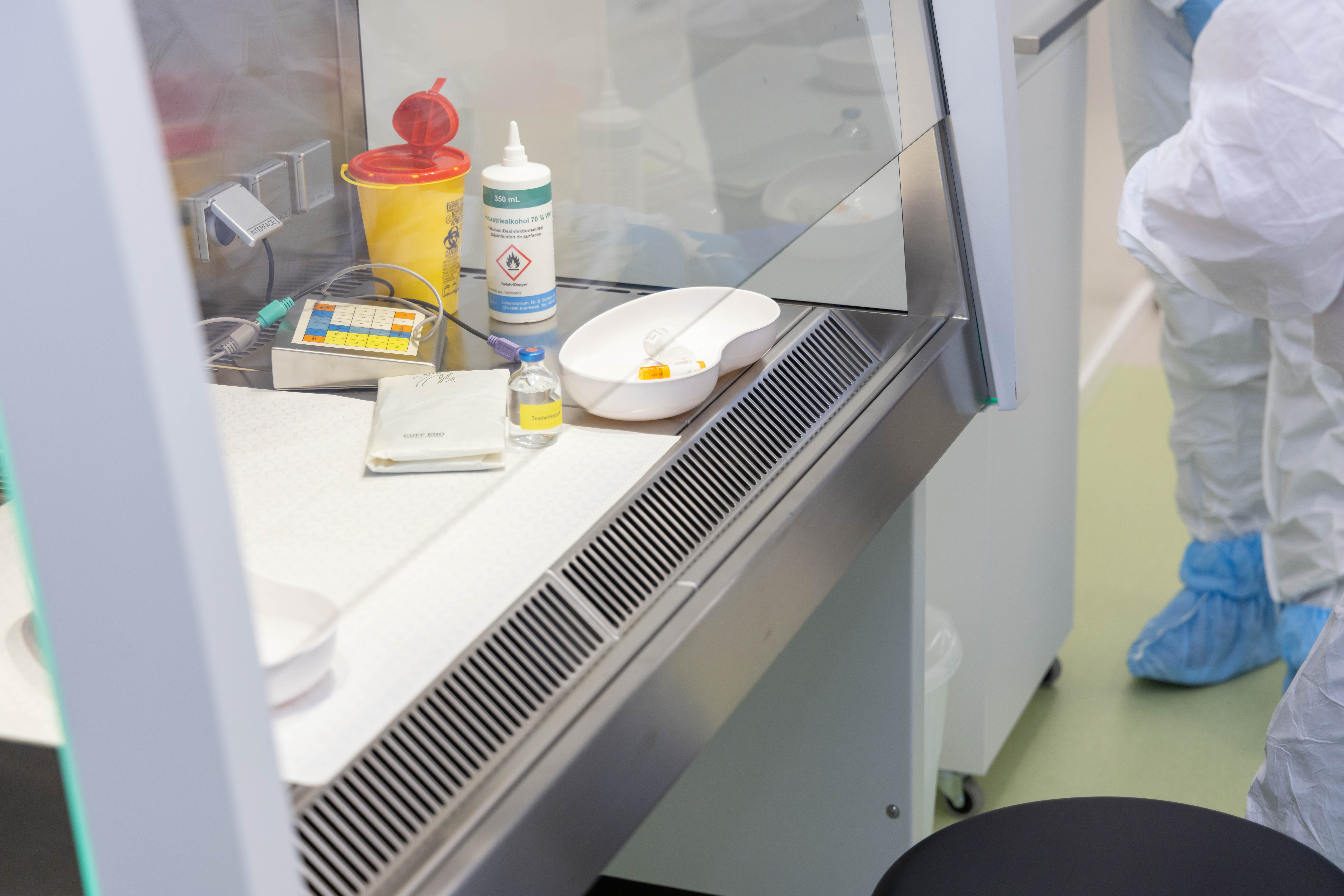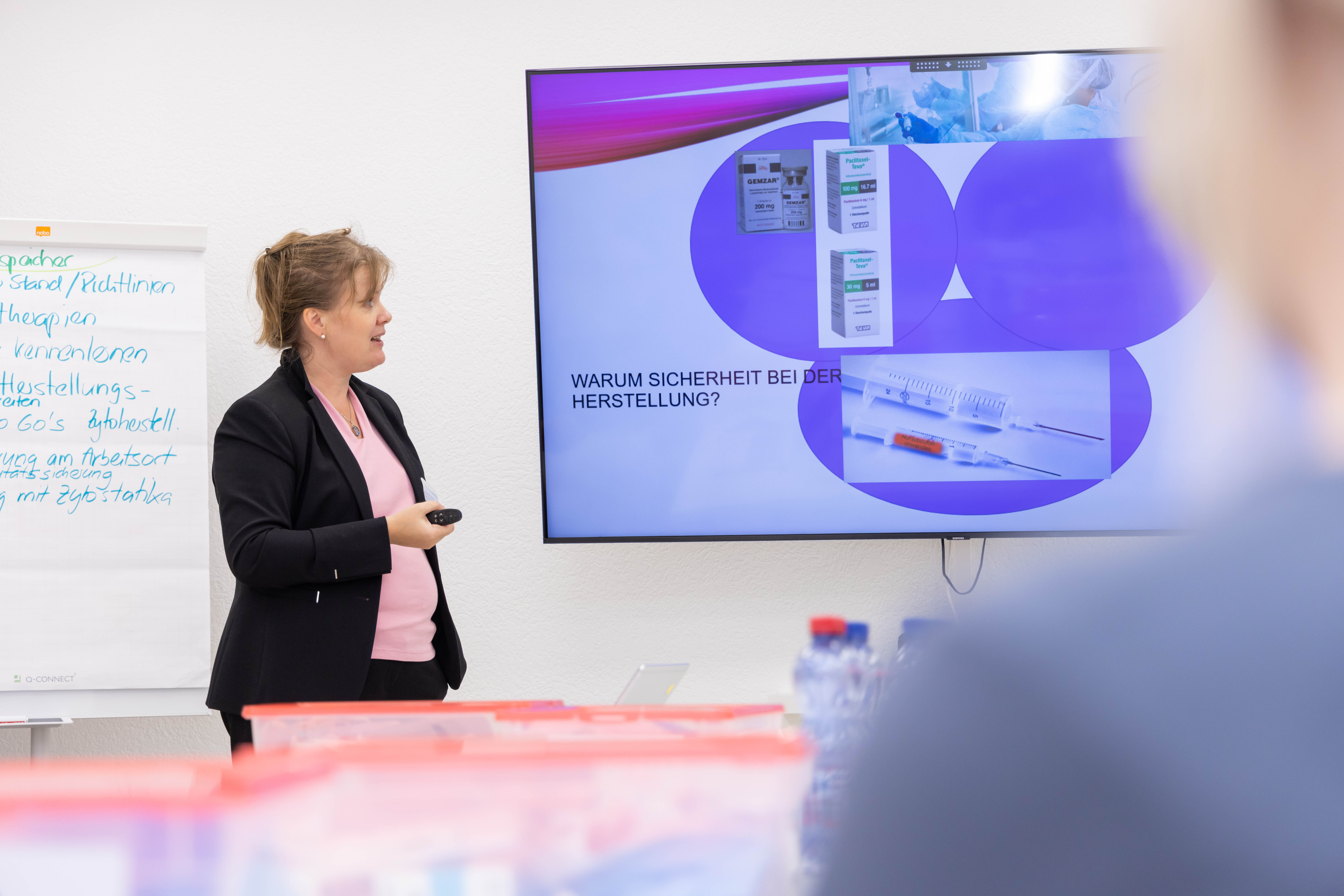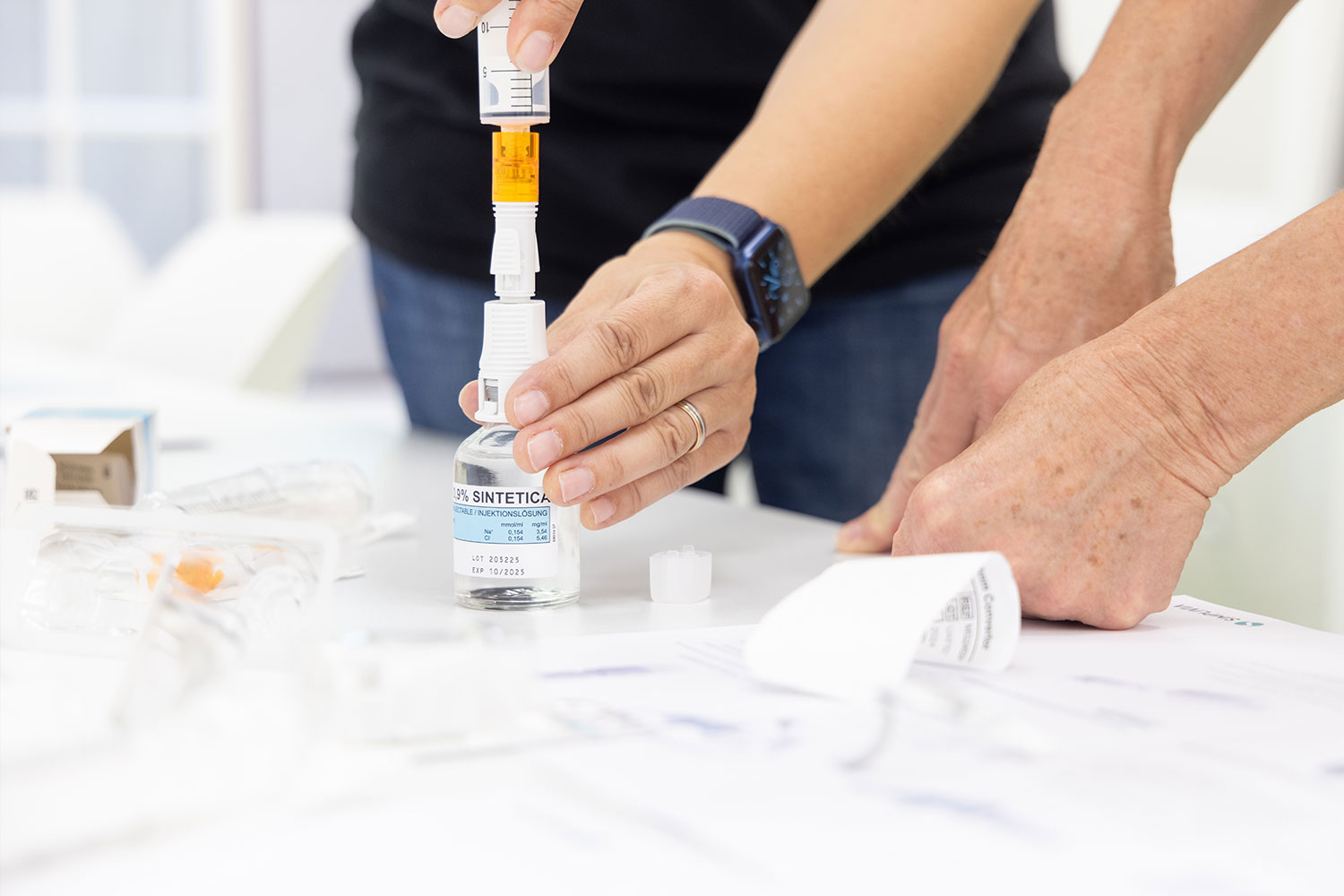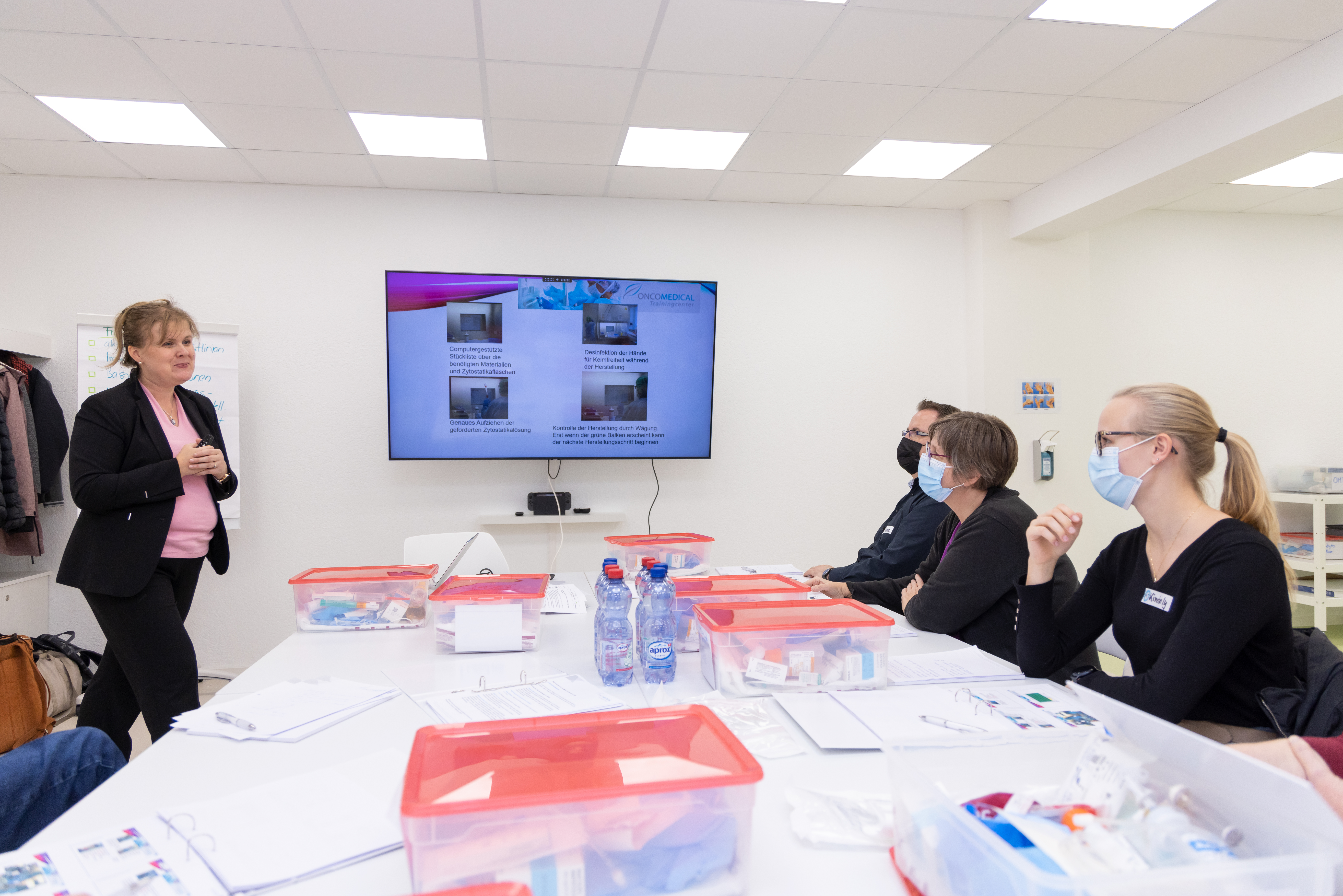 Das OncoMedical Trainingcenter besteht aus zwei voneinander getrennten Räumen und Trainingsgebieten. Im ersten Raum wird die individuelle Zubereitung der Onkologika an einer der modernsten Sicherheitswerkbänke geschult. Der zweite Raum dient dazu, den Umgang und die Pflege von Portsystemen mit dem neuen Patientensimulator praxisnah zu trainieren.